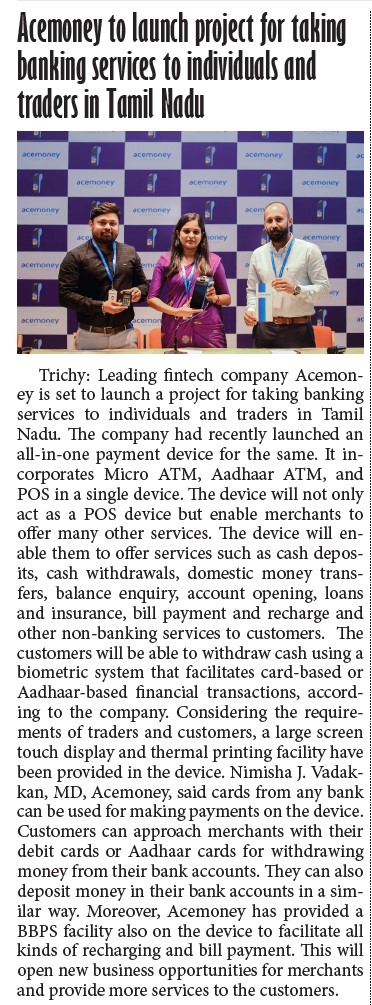 Acemoney was featured in the media for its growing role in expanding digital financial and payment services across Kerala, supporting inclusive access and reliable technology-driven solutions.