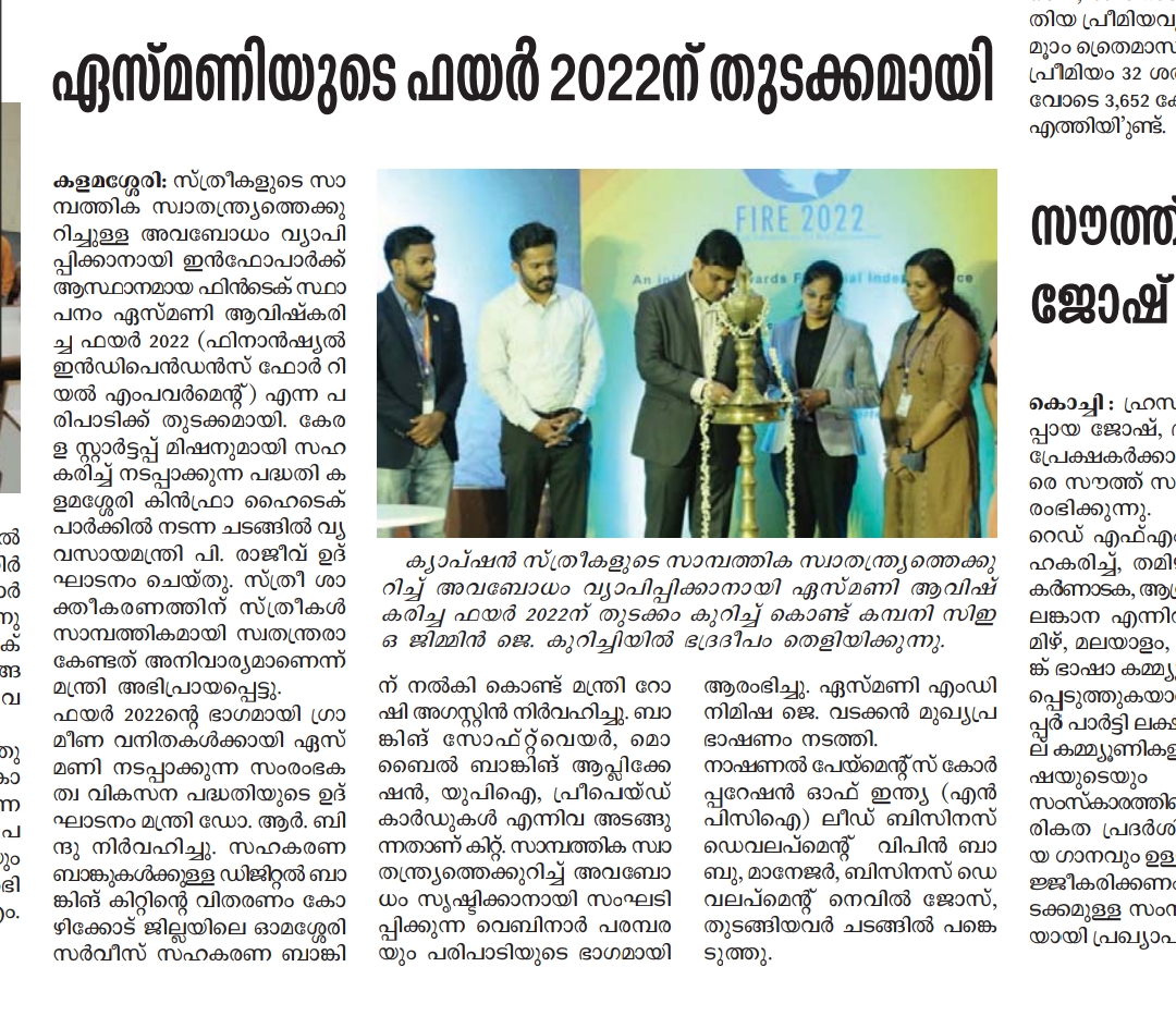 “The Acemoney Fire 2022 event was inaugurated by Minister P. Rajeev at the Startup Mission Office, Kalamassery.”