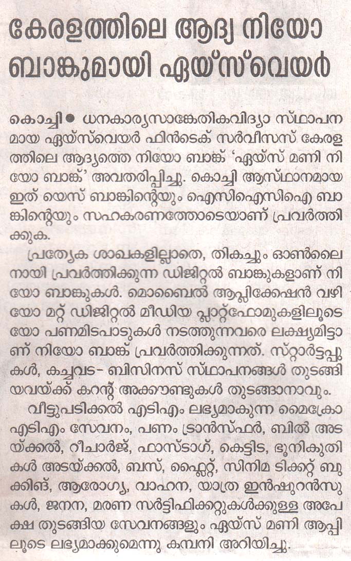 കേരളത്തിലെ ആദ്യ നിയോ ബാങ്കുമായി ഏയ്സ്വെയർ - Kerala's first neobank by Aceware