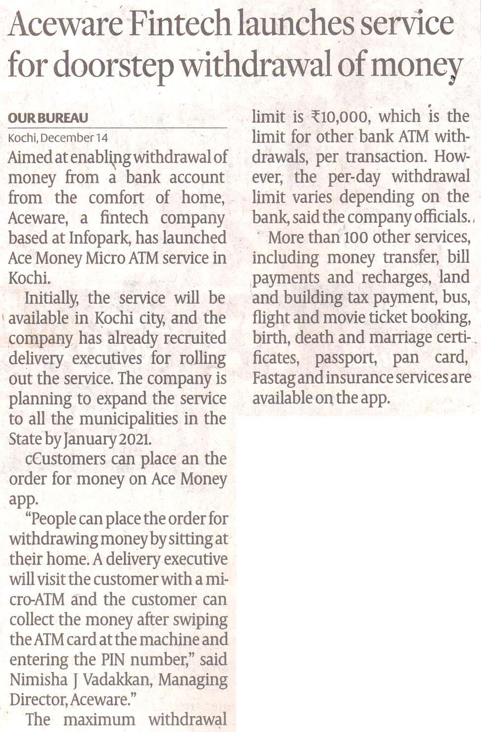 Aimed at enabling withdrawal of money from a bank account from the comfort of home, Aceware, a fintech company based at Infopark, has launched Ace Money Micro ATM service in Kochi. Initially, the service will be available in Kochi city, and the company has already recruited delivery executives for rolling out the service. The company is planning to expand the service to all the municipalities in the State by January 2021. Customers can place the order for money on Ace Money app. “People can place the order for withdrawing money by sitting at their home. A delivery executive will visit the customer with a micro-ATM and the customer can collect the money after swiping the ATM card at the machine and entering the PIN number,” said Nimisha J Vadakkan, Managing Director, Aceware. The maximum withdrawal limit is ₹10,000, which is the limit for other bank ATM withdrawals, per transaction. However, the per-day withdrawal limit varies depending on the bank, said the company officials. More than 100 other services, including money transfer, bill payments and recharges, land and building tax payment, bus, flight and movie ticket booking, birth, death and marriage certificates, passport, pan card, Fastag and insurance services are available on the app